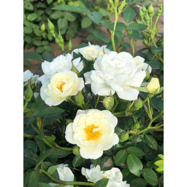 Een doorbloeiende bodembedekker met goed gevulde witte rozen in trossen.