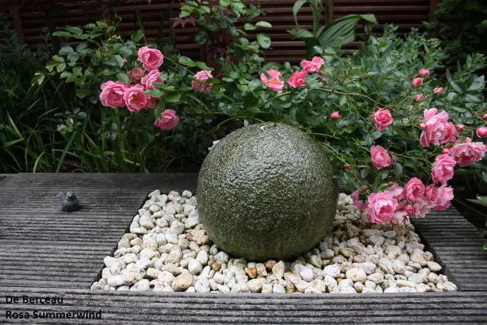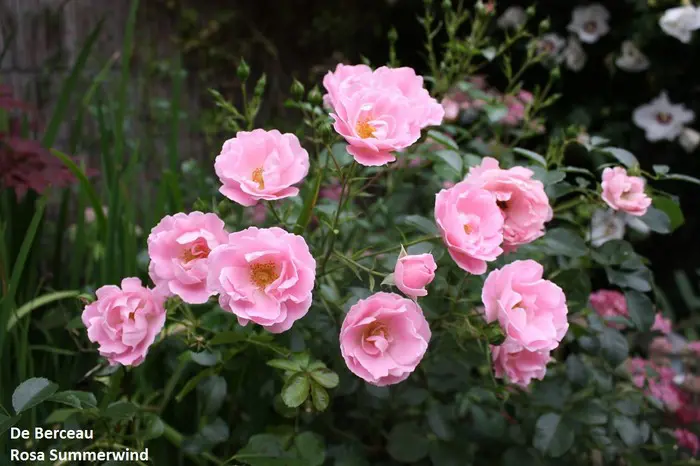 Rosa ''Summerwind' bloeit met zacht geurende roze bloemen waarvan de randen van de bloemblaadjes gegolfd zijn.