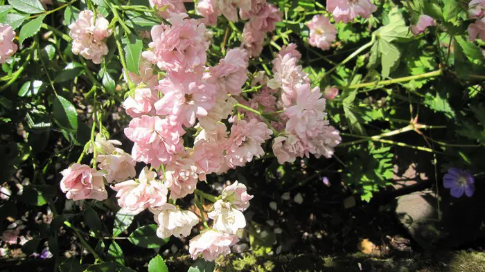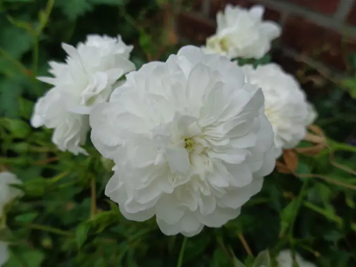 Een kruipende bodembedekkende roos met kleine witte dubbele roosjes in trossen.