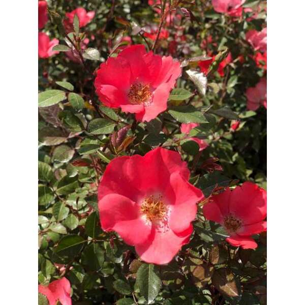 Rosa 'Coral Meidiland' is een doorbloeiende roos met enkelvoudige koraal/zalmroze bloemen.