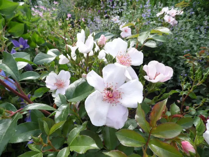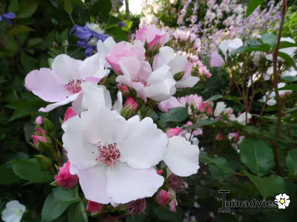 Goed te combineren met roze of witte rozen, ook met blauwe bloemen zoals Delphinium Piccolo, zachtblauwe Geraniums, Penstemons, Gentiaan en Gaura.