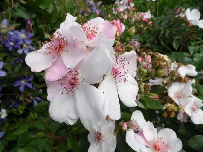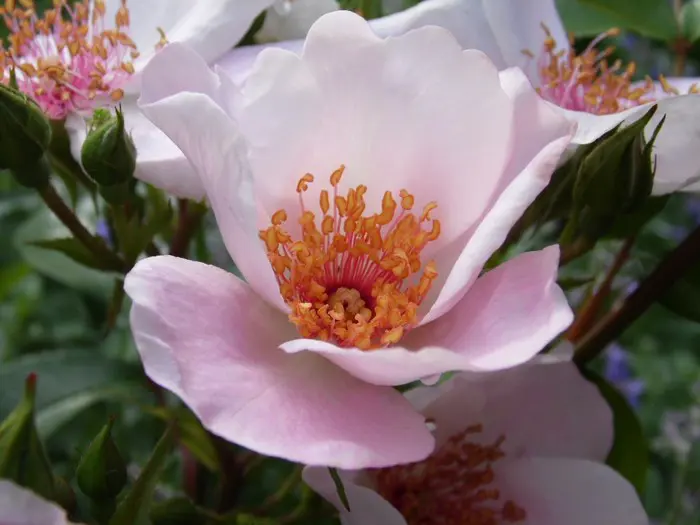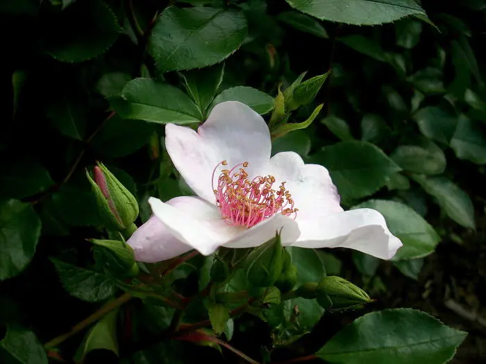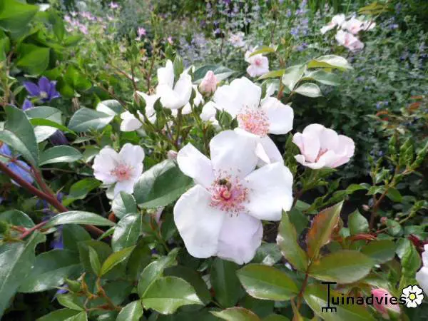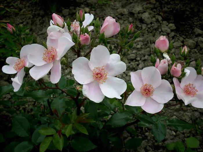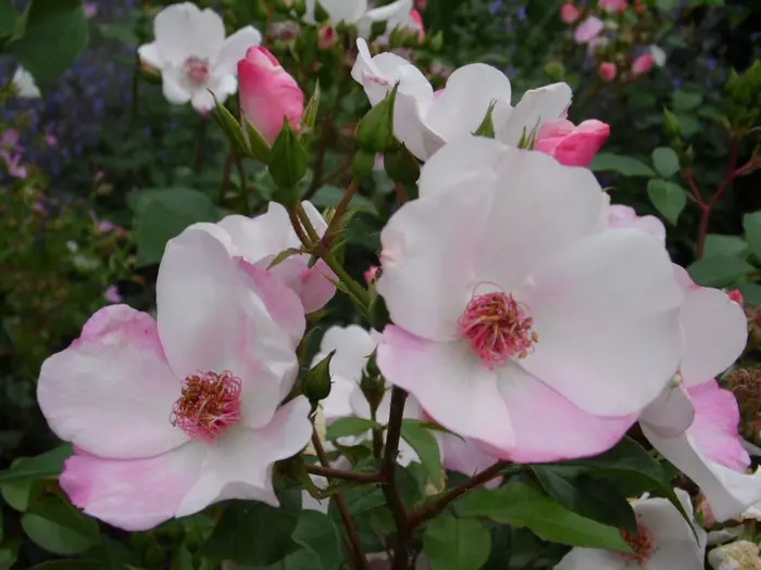 Bodembedekkende en vroegbloeiende struikroos met lichtroze tot wit verkleurende enkelvoudige bloemen.