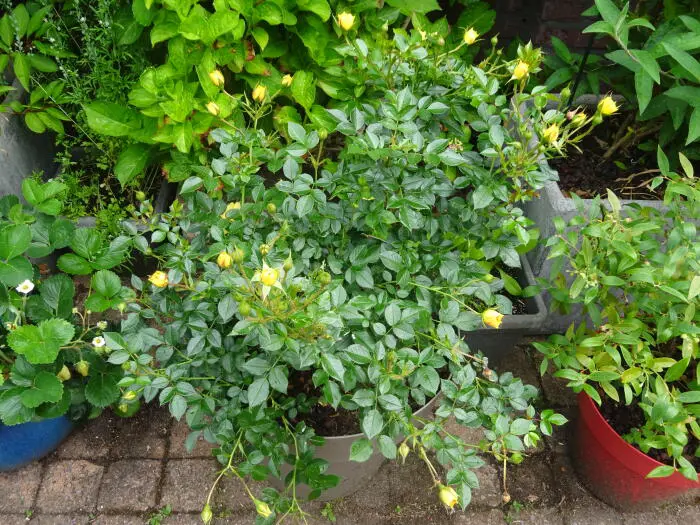 Rosa 'Bienenweide Gelb' is een doorbloeiende roos met trosjes van halfgevulde komvormige gele bloemen.