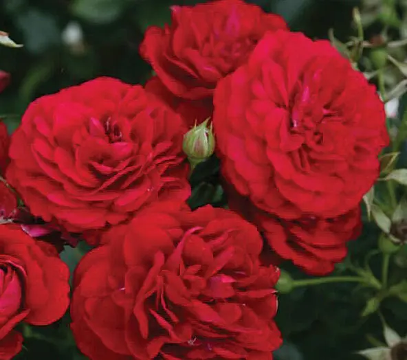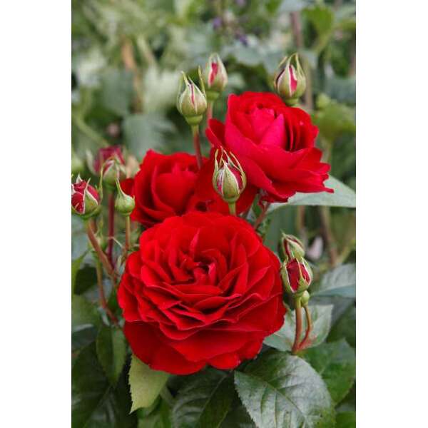 Rosa 'Bordeaux' is een zachtgeurende doorbloeiende roos met goed gevulde komvormige fluweelrode bloemen.