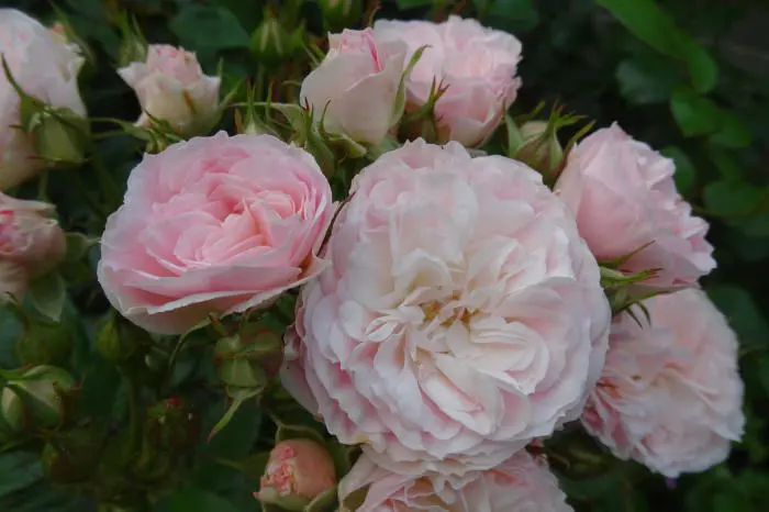 Vormt een bossige struik met dichte bloemtrossen van zacht geurende roosjes.