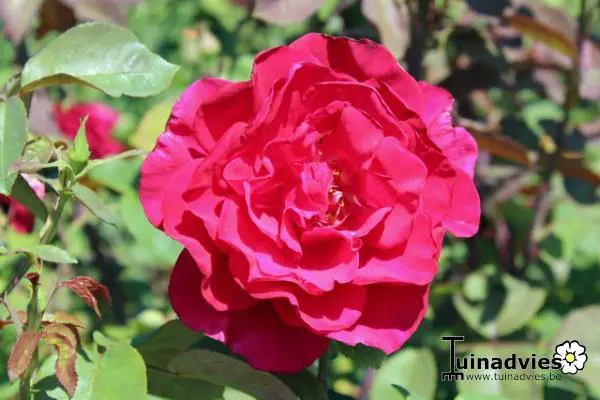 Een theehybride met sterk geurende, donkerrode bloemen.