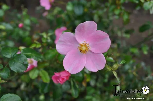 'Fortuna' bloeit rijkelijk met enkelvoudige zalmroze roosjes met een wit hart gevolgd door bottels.