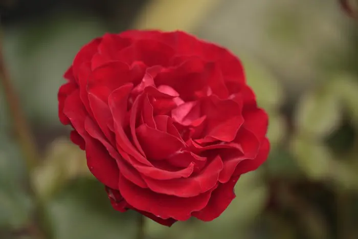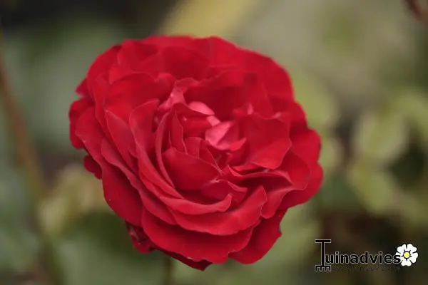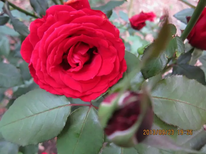 Rosa 'Nina Weibull' bloeit met bloedrode, goedgevulde rozen.