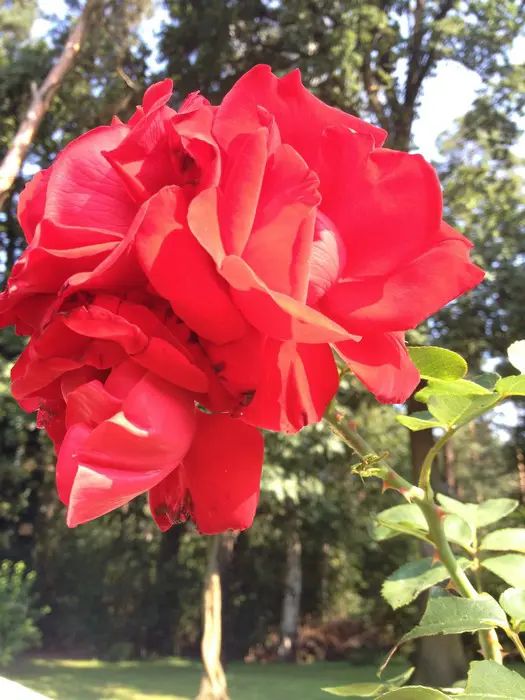 Een grote bossige struik met grote, donkerrode rozen, matige geur maar weersbestendig.
