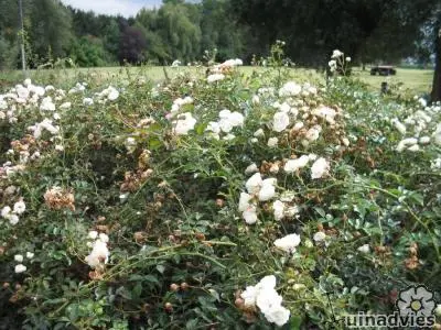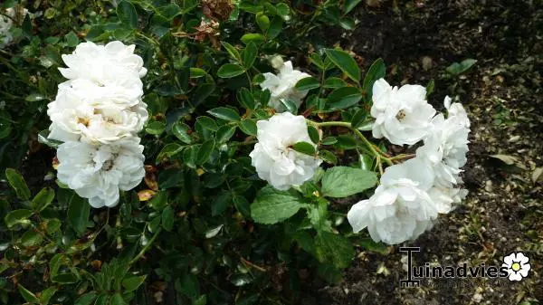 Het is een zuiverwitte licht geurende roos die bij het open gaan in het midden rozig is, trossen van soms 20 roosjes van 6 cm