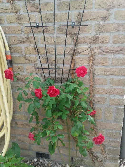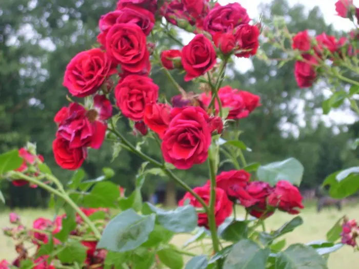 Een herbloeiende klimroos met bloedrode bloemen en glanzende bladeren.
