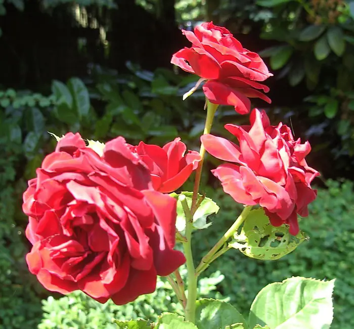 Rosa 'That's Jazz' bloeit met volle donkerrode rozen met mooi glanzend donkergroen blad.