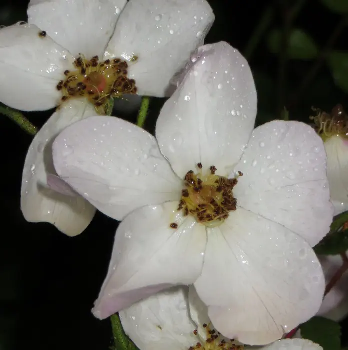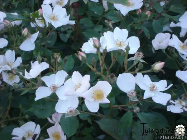 Rosa ‘White Fleurette’ vormt een bossige struik met trosjes van kleine witte roosjes met lange gele meeldraden.
