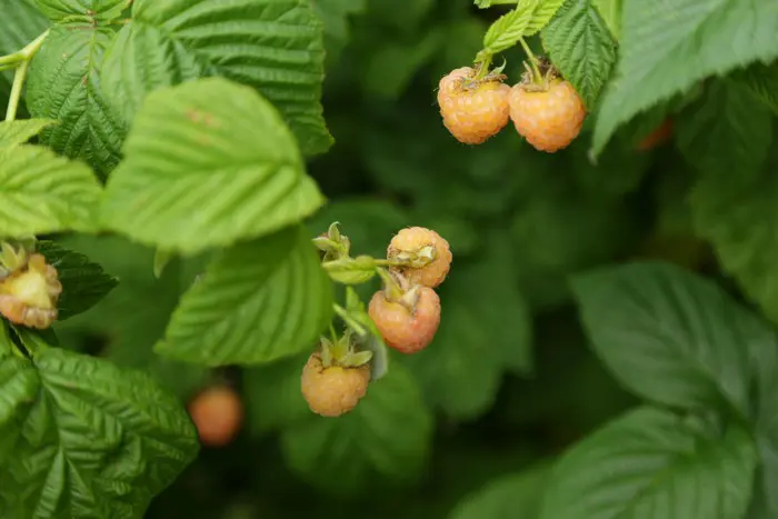 De gele zoete Fallgold' is rijp vanaf juli (herfstframboos), is minder productief, wel ziekteresistent.