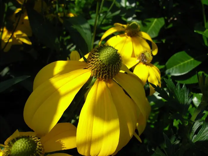 Rudbeckia nitida is een sterke, rechtopstaande vaste plant met geveerde bladeren verdeeld met getande, donkergroene blaadjes en vertakte stengels met citroengele bloemblaadjes rond een groen tot donkerbruine kegel.