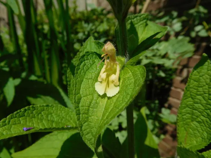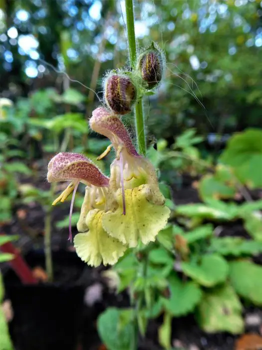 Salvia flava var. megalantha bloeit rijkelijk met tal van gele bloempjes met een paarsbruine lip.