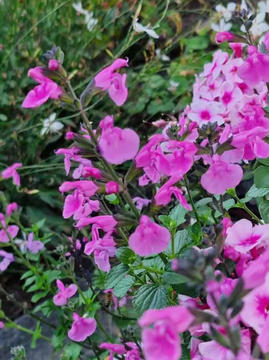 Salvia 'Flower Child' is een compacte en dicht vertakte plant met grote suikerroze bloemen.