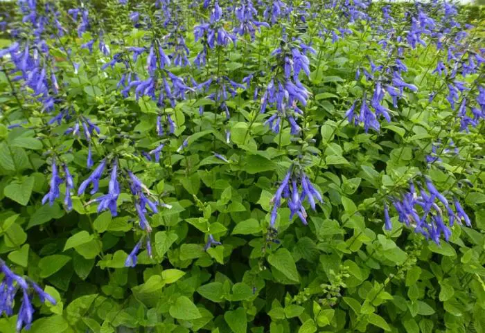 Salvia guaranitica 'Blue Enigma' bloeit met zeer diepblauwe, grote bloemen aan zwarte stelen.