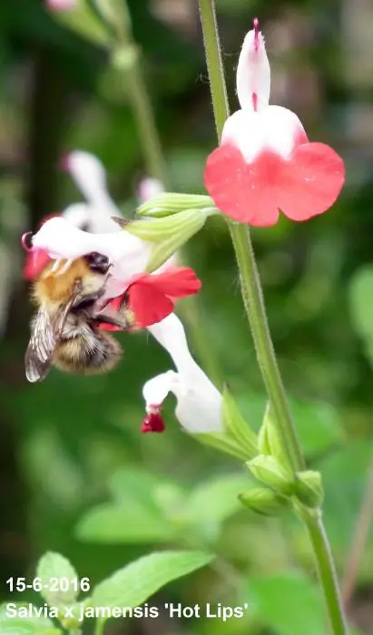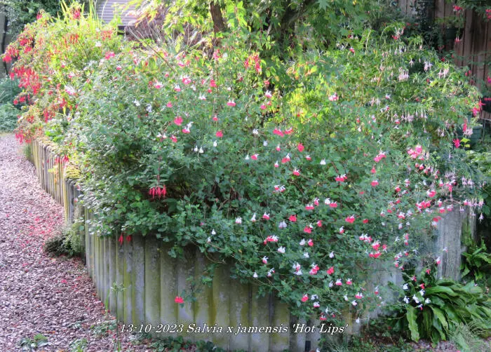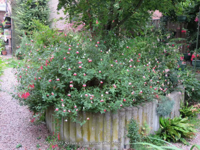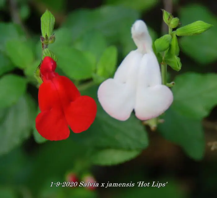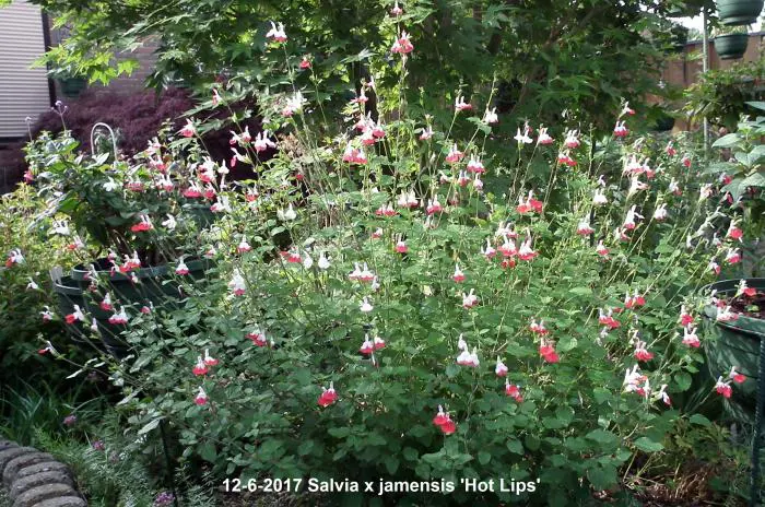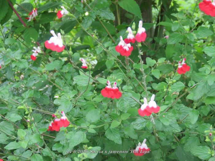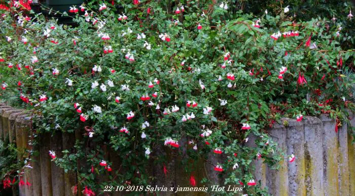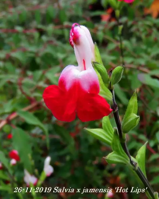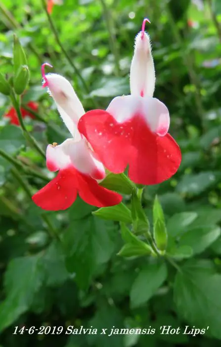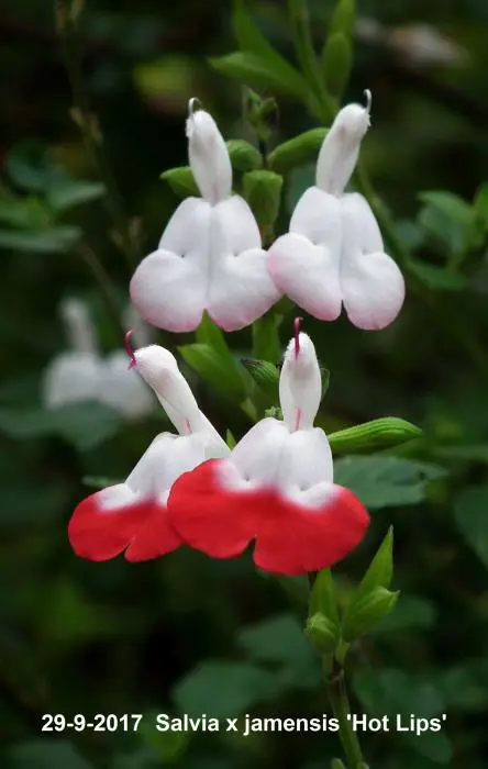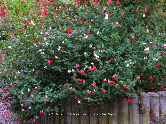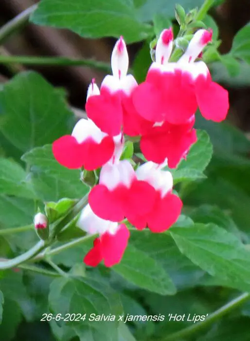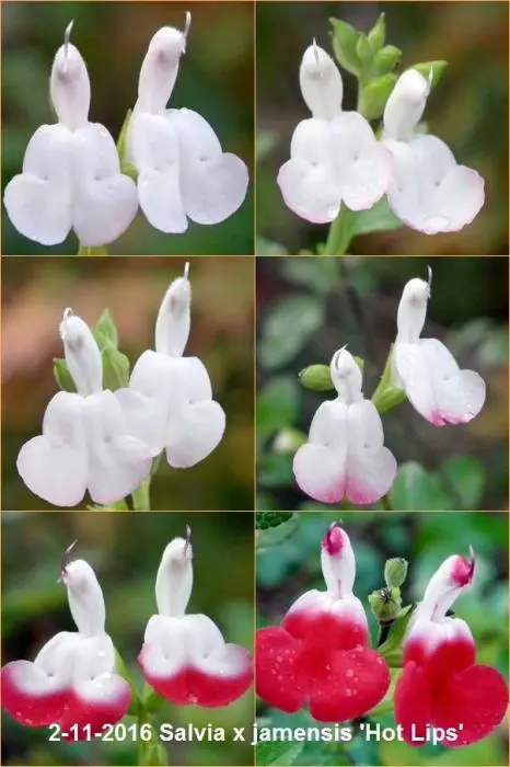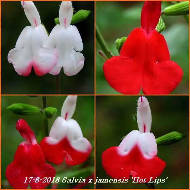 Salvia x jamensis 'Hot Lips' bloeit met opvallende trompetvormige bloemen, de witte bloempjes hebben een knalode onderlip. Bij warm weer in de zomer kan het gebeuren dat de bloemen volledig wit of volledig rood worden, om dan bij koeler weer weer op normaal rood/wit te komen.