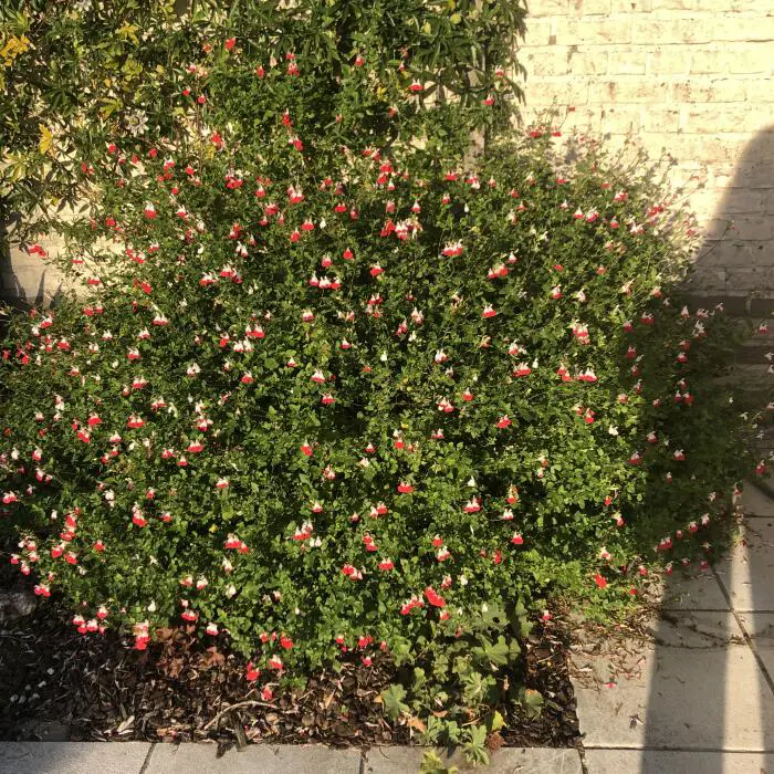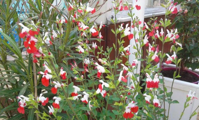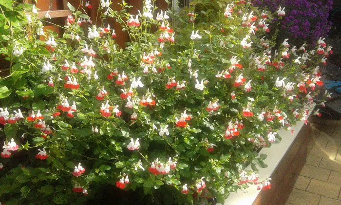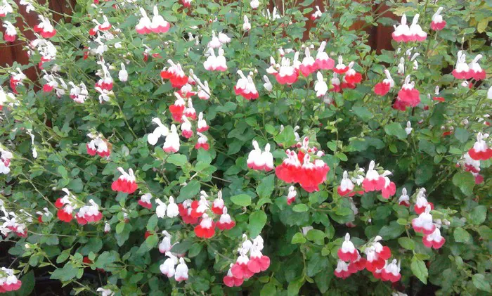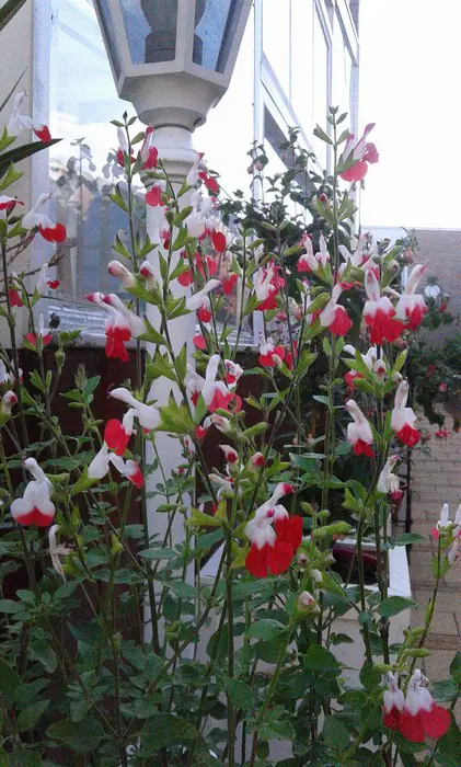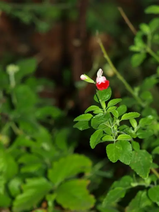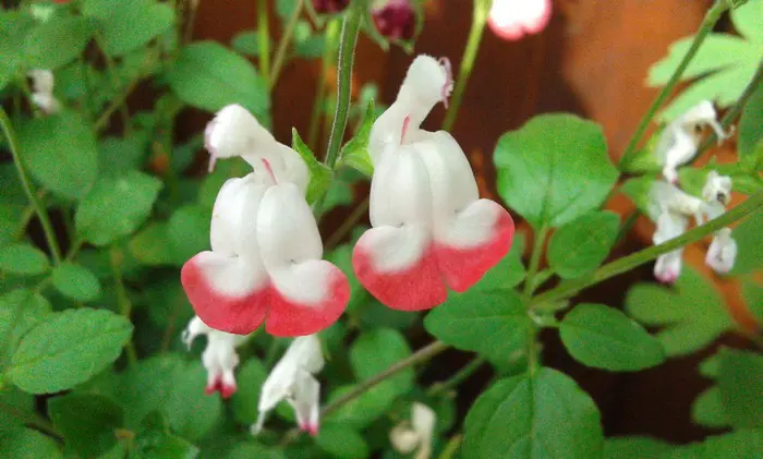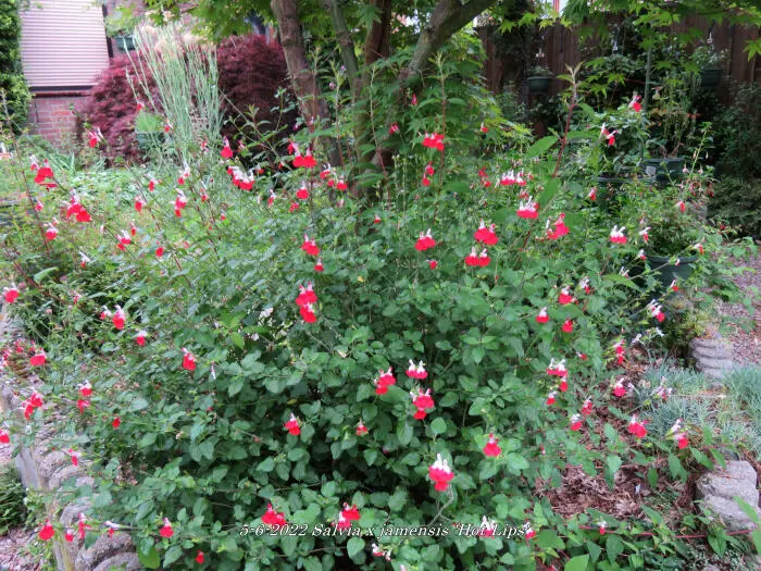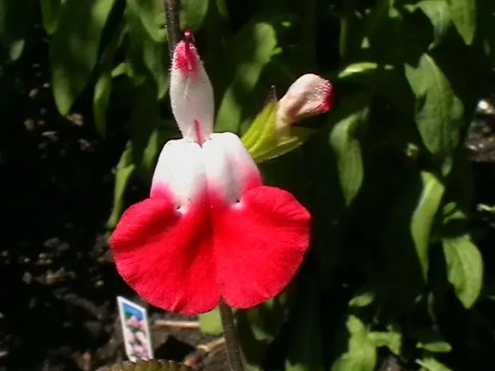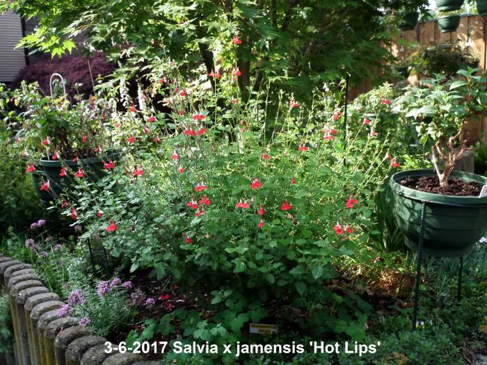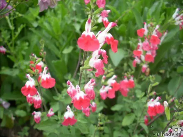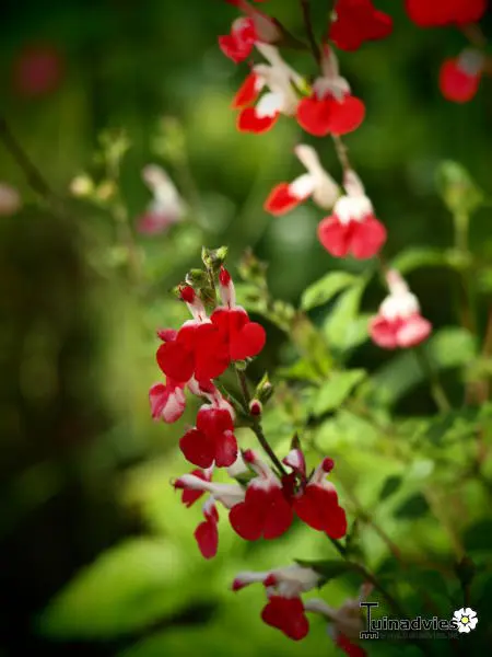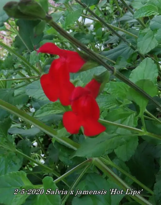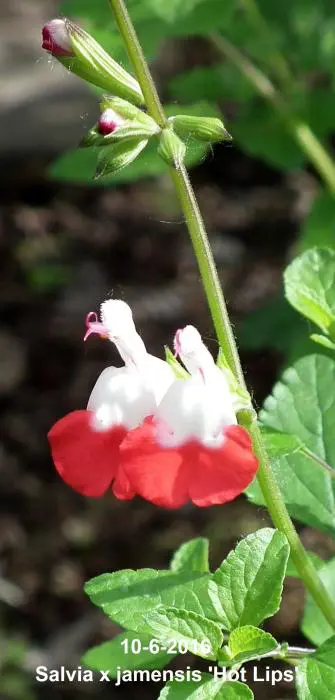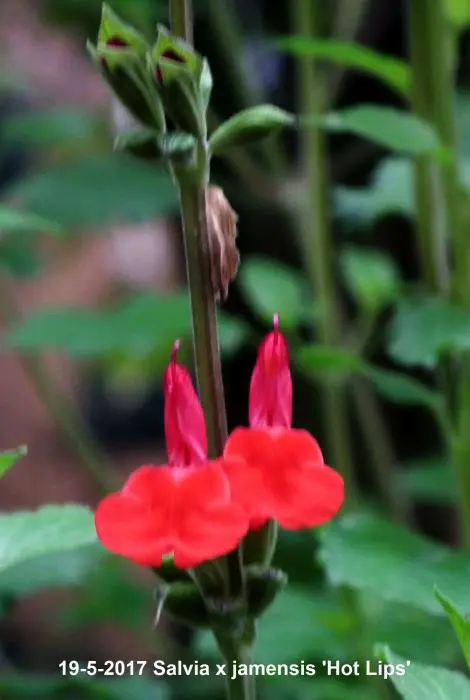 Salvia x jamensis 'Hot Lips' bloeit met opvallende trompetvormige bloemen, de witte bloempjes hebben een knalode onderlip. Bij warm weer in de zomer kan het gebeuren dat de bloemen volledig wit of volledig rood worden, om dan bij koeler weer weer op normaal rood/wit te komen.