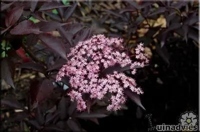 Heester met donker bijna zwarte bladeren. De bloemen staan in schermen en zijn rozewit. Ze vallen mooi op tegen het donkere blad. Makkelijke struik die toch goed opvalt