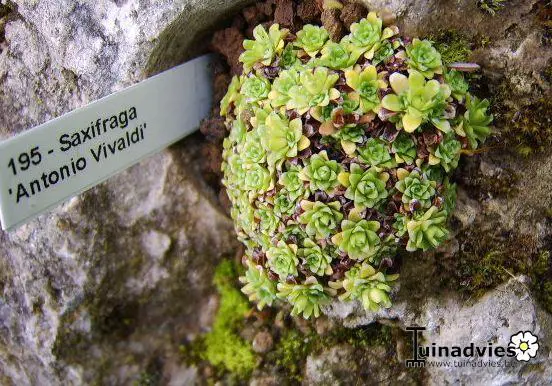 Saxifraga 'Antonio Vivaldi' vormt kleine rozetten met groene blaadjes.