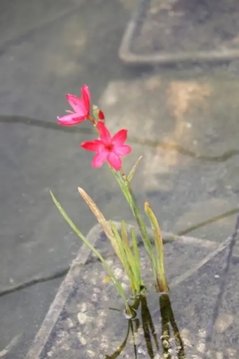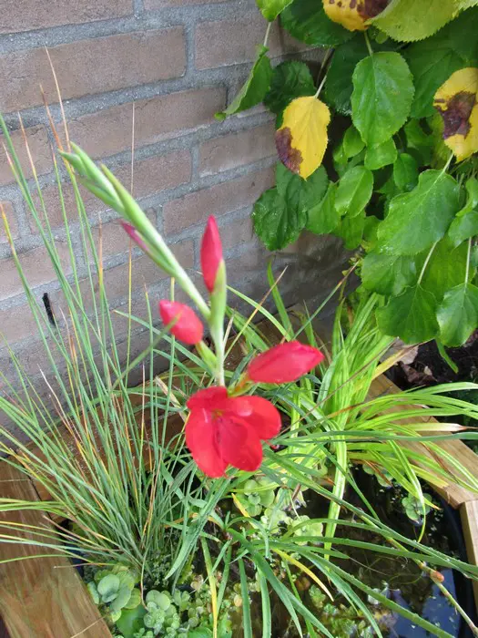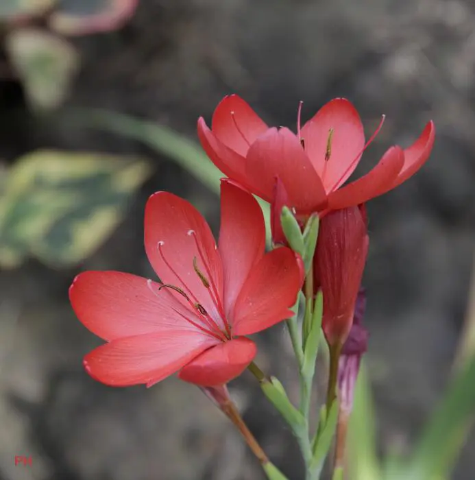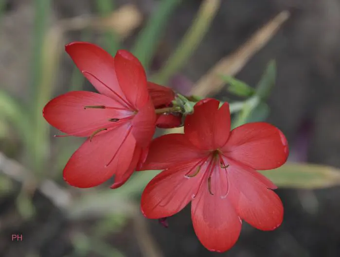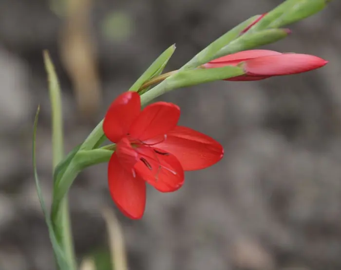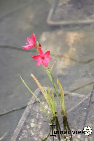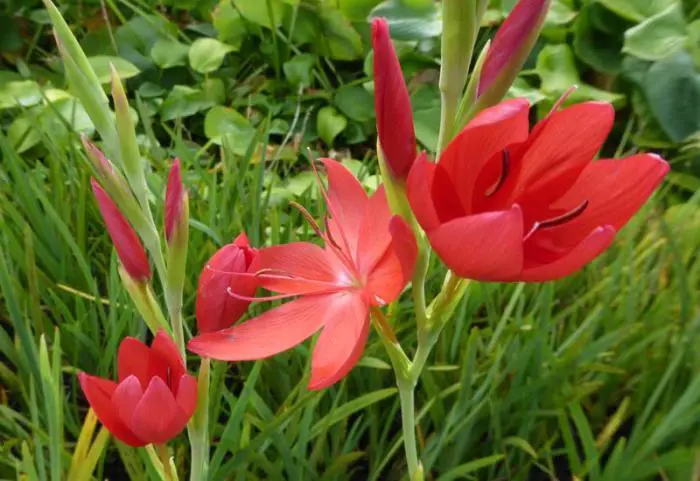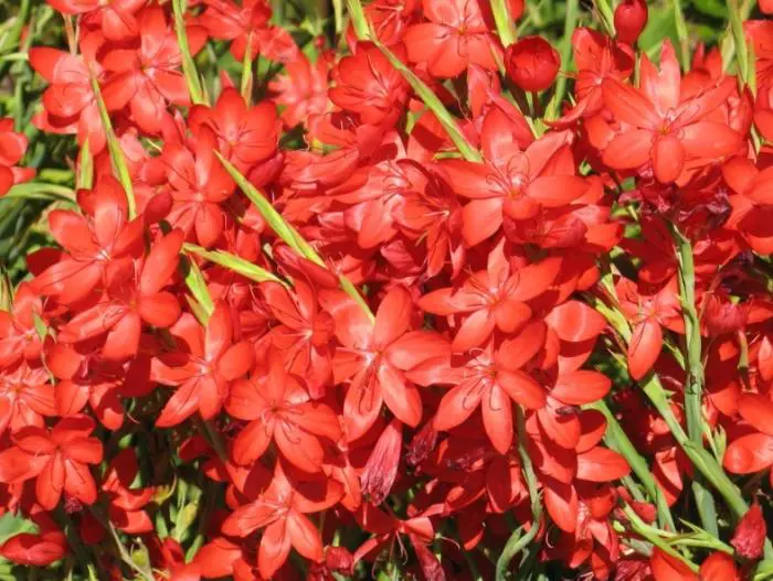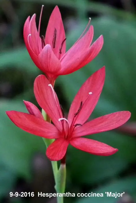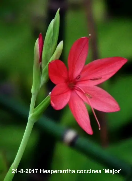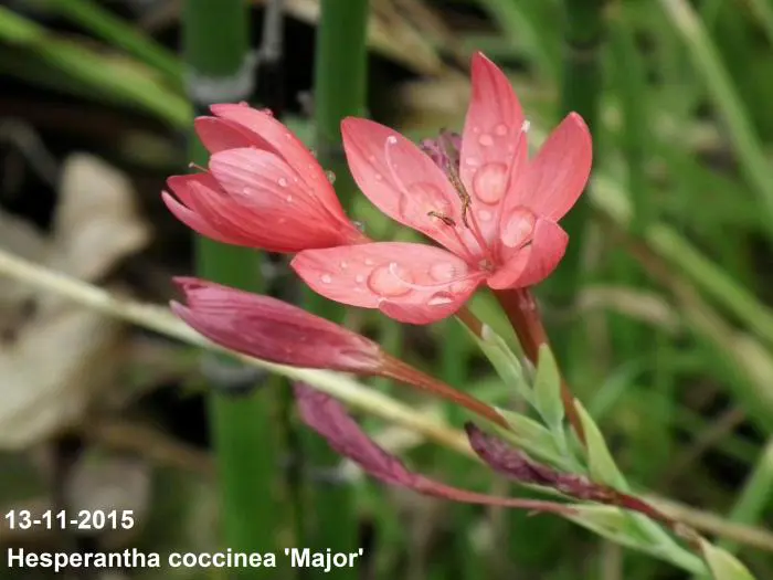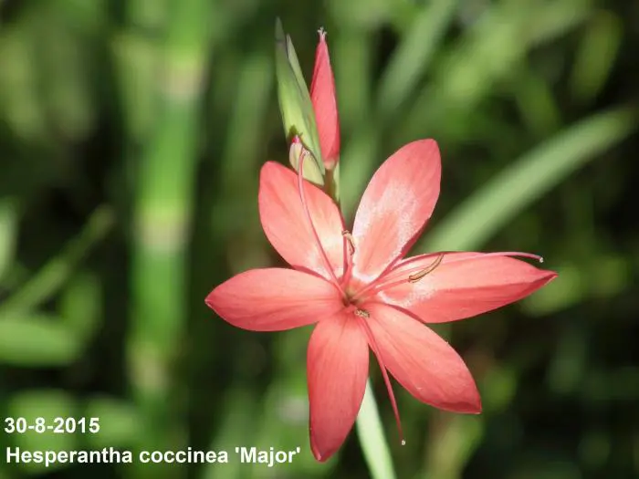 Hesperantha coccinea 'Major' is een rhizomateuze vaste plant met smalle, zwaardvormige, lichtgroene bladeren en stevige stengels met losse bloei van karmozijnrode bloemen.