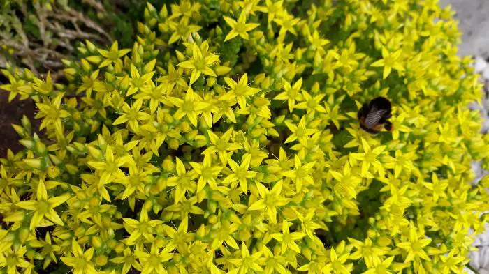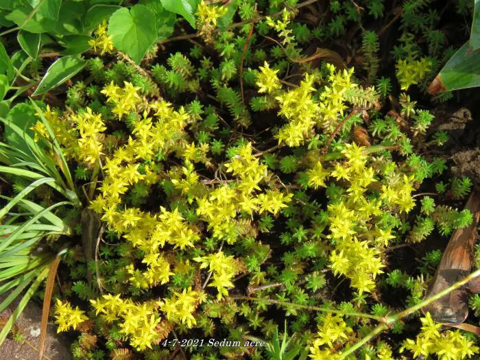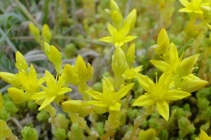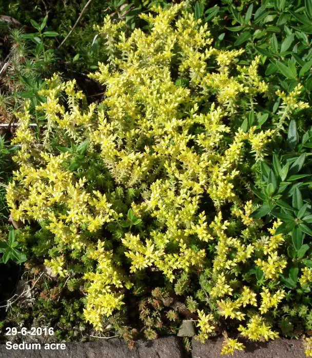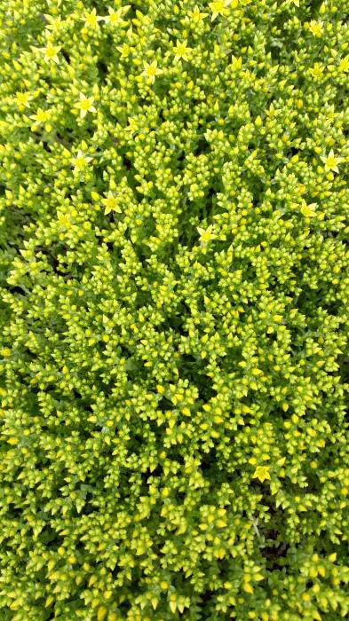 Sedum acre is een kleine vaste plant die ideaal is om vergeten hoekjes te bedekken met een tapijt van glanzende gele sterachtige bloempjes.