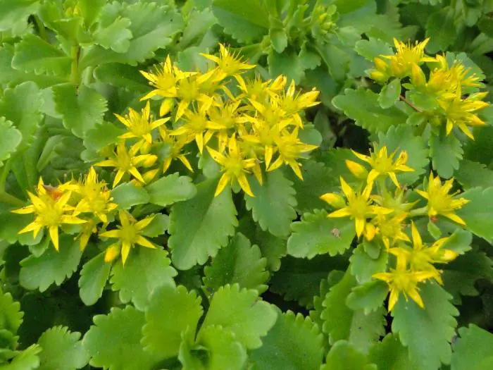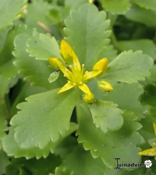 Sedum Kamtschaticum is een kleine bodembedekker met grof gezaagde diepgroene vlezige bladeren.