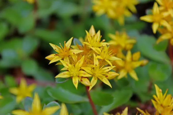 Sedum Kamtschaticum is een kleine bodembedekker met grof gezaagde diepgroene vlezige bladeren.