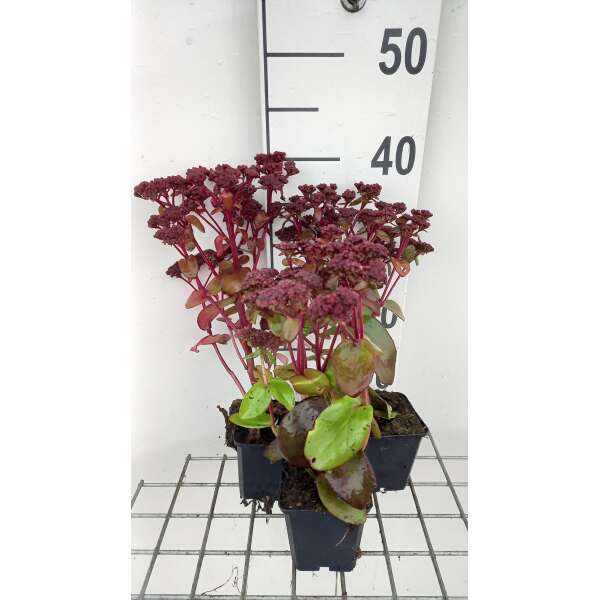 Sedum telephium (Atropurpureum Group) 'Karfunkelstein' heeft paarsrode vlezige bladeren met paarroze bloei.