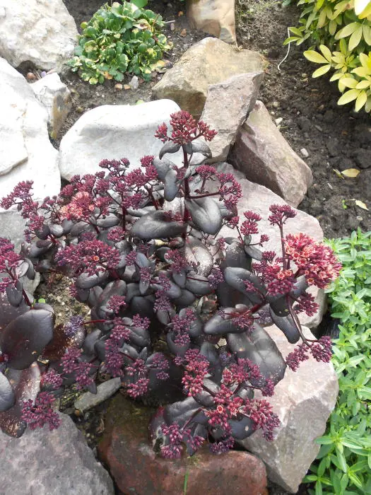 Sedum 'Touchdown Teak' is een rechtopgroeiende vetplant met een glanzende roodbruine tot donker paarsbruine kleur. In de zomer bloeit de plant rozerood.