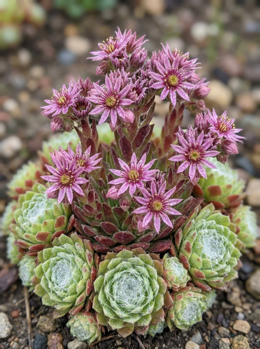 Sempervivum 'Sprite' vormt rode harige rozetten die bleker kleuren in de zomer.
