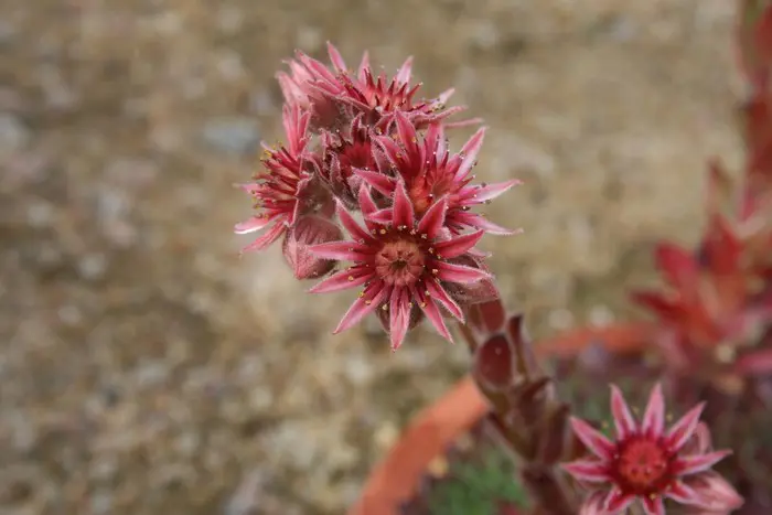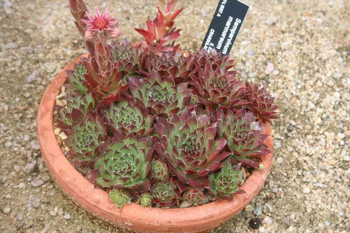 Sempervivum marmoreum vormt rozetten van helder blauwgroene bladeren die rood dooraderd zijn.
