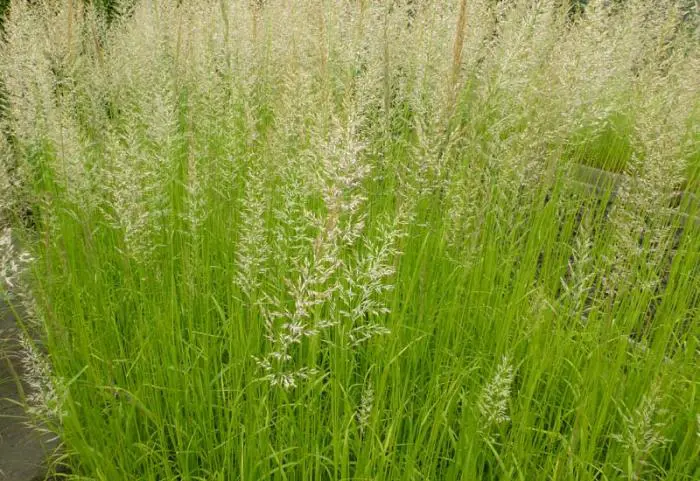 Bloeit in de vroege zomer met smalle, zacht rozebruine tot blond verkleurende pluimen.
