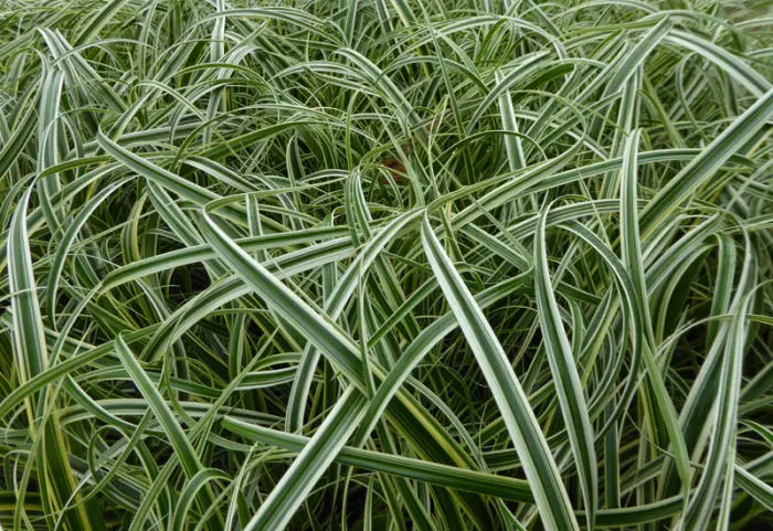 Carex 'Feather Falls' vormt smalle lange bladeren met een cremegeel randje.