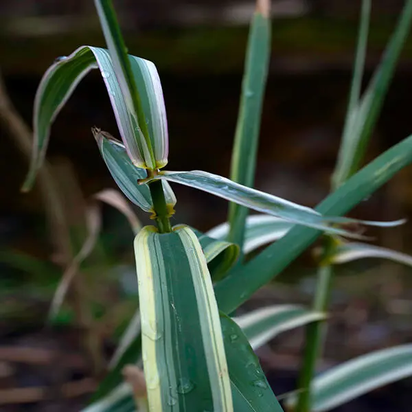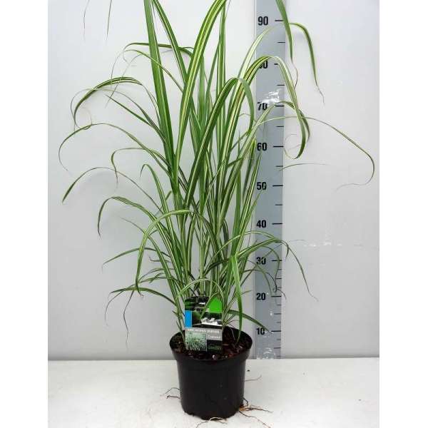 Miscanthus sinensis 'Cabaret' heeft wit-groen gestreepte bladeren.
