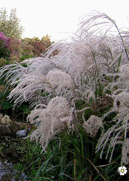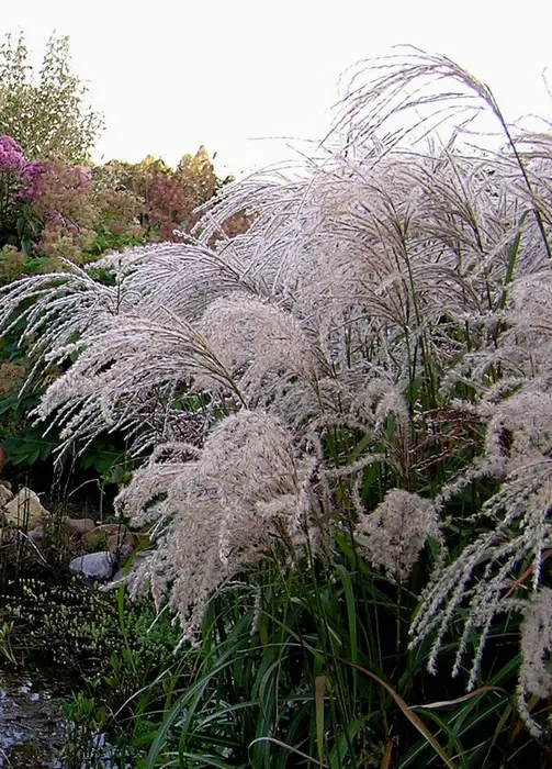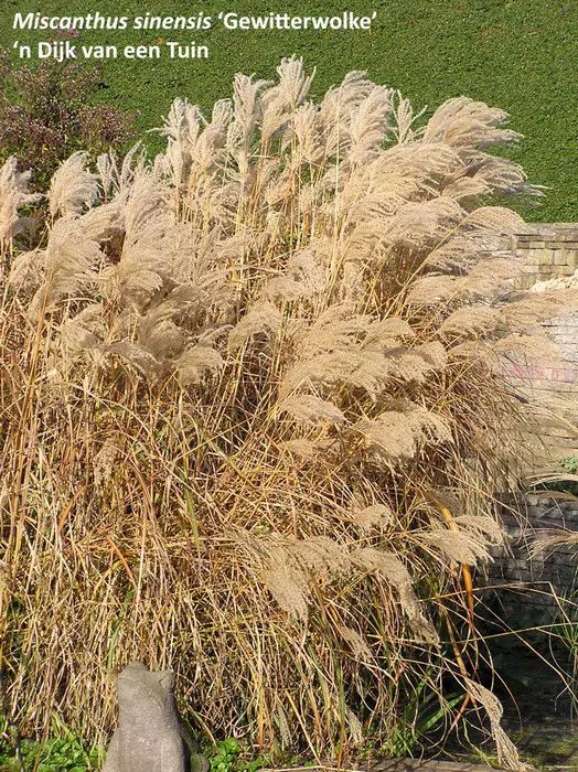 Miscanthus sinensis 'Gewitterwolke' erg mooi sierriet waarvan het blad een witte streep heeft over gans de lengte.