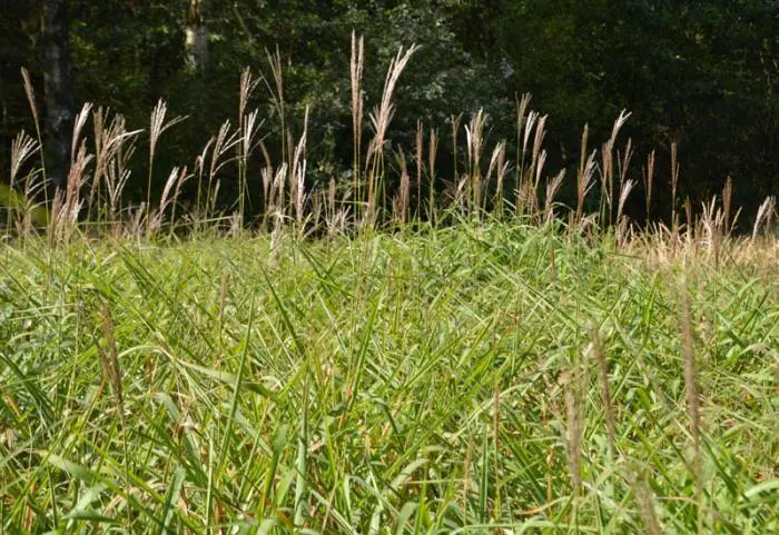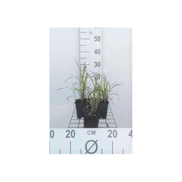 Het groen blad van de Miscanthus sinensis var. purpurascens kleurt purperrood/koperrood in het najaar en bloeit met zilverwitte pluimen.