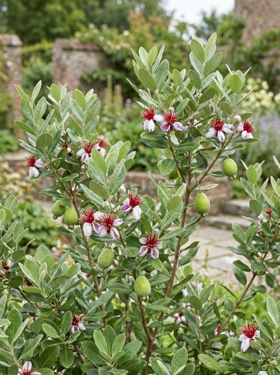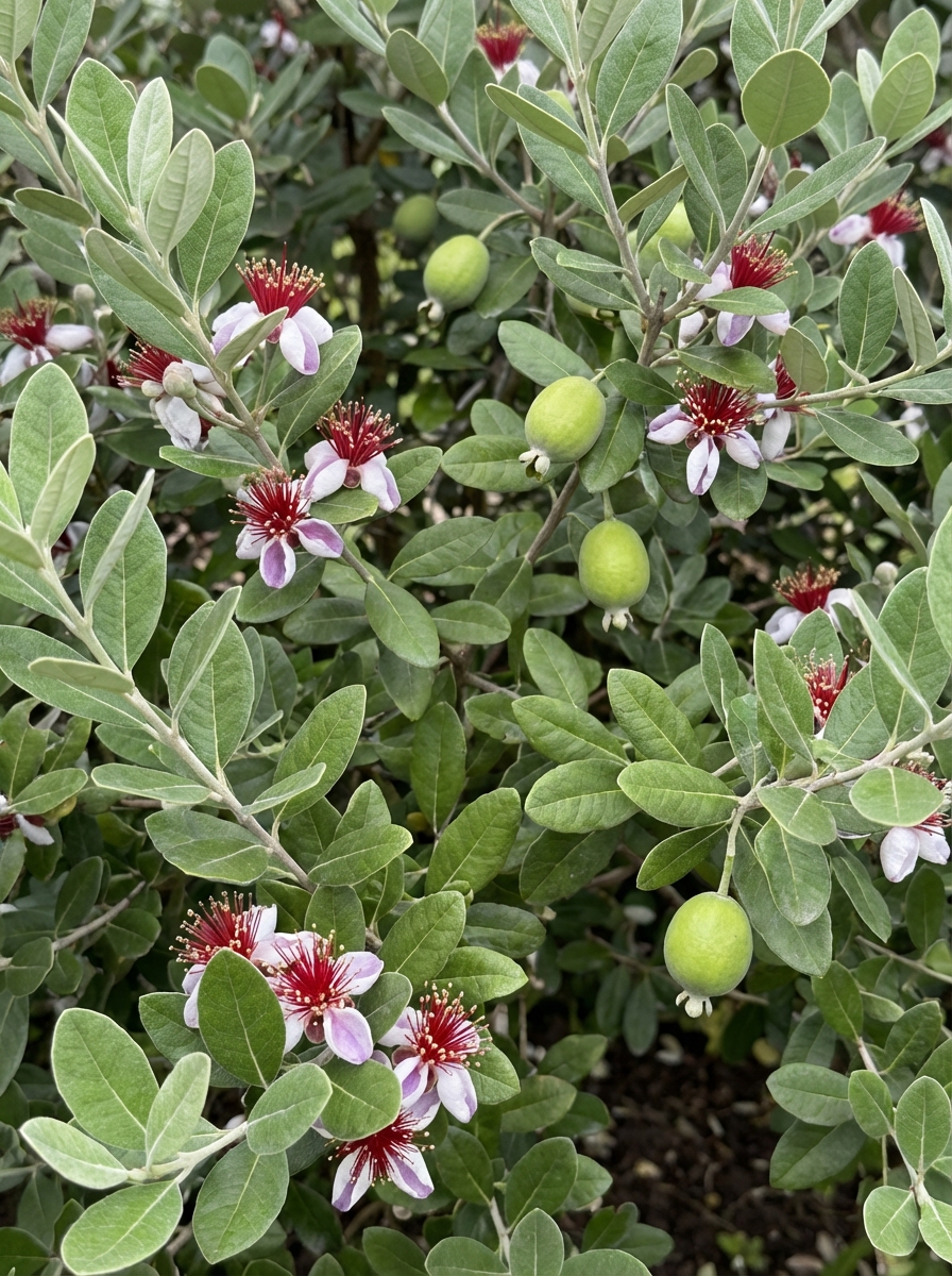 Acca sellowiane is een middelgrote groenblijvende heester en bloeit met geurende witroze bloemen waarvan de opvallende lange meeldraden rood zijn, gevolgd door eetbare groenrode vruchten met een zoetzure ananassmaak