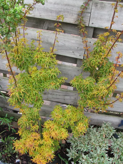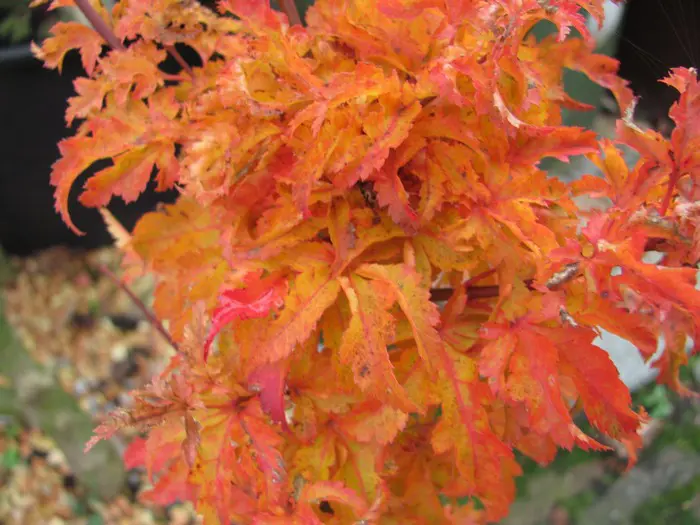Acer palmatum 'Shishigashira' is een compact en zeer dicht bebladerde struik met merkwaardig gekruld blad, zacht groen in de lente, donkerder in de zomer voordat hij vurige, oranjerode/oranjegele tinten krijgt in de herfst.
