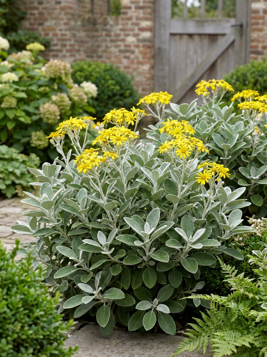 Een mooi heestertje met zilverviltige blaadjes en gele kleine margrietachtige bloemen.