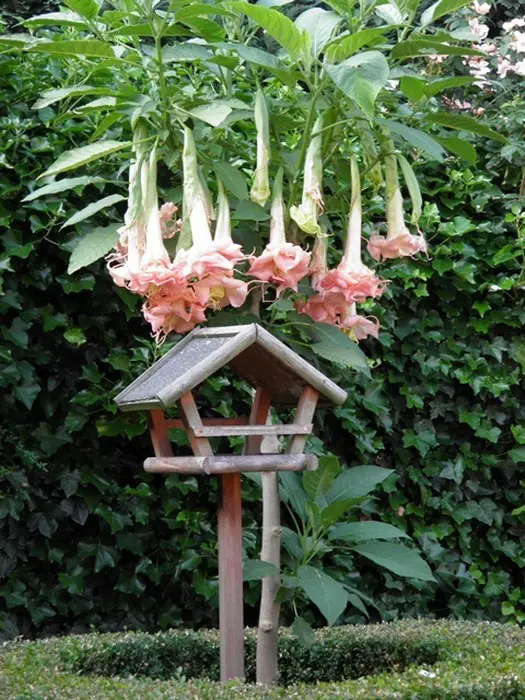 De grote trompetachtige bloemen zijn driedubbelbloemig, bloeien eerst roomwit en kleuren snel schelproze. Ze geuren lichtjes naar vanille.