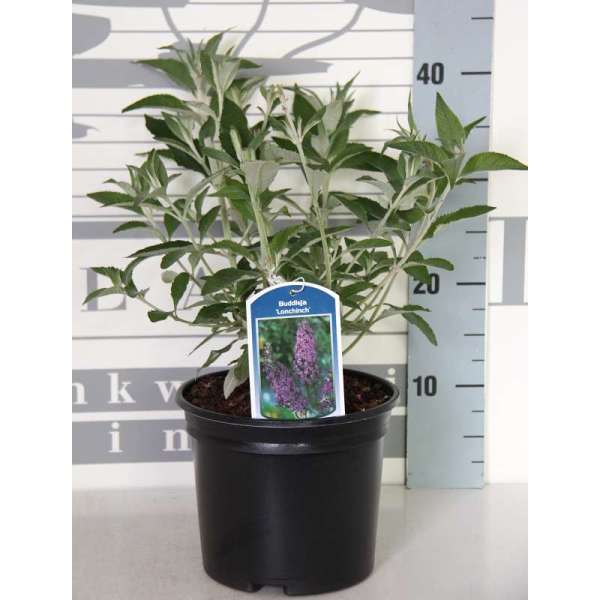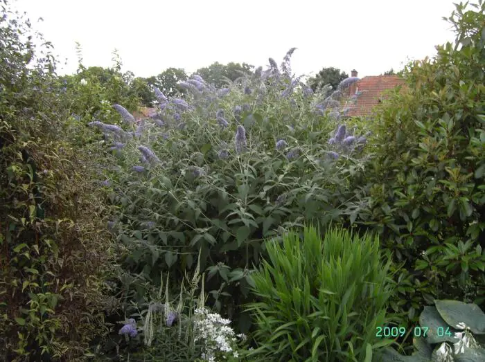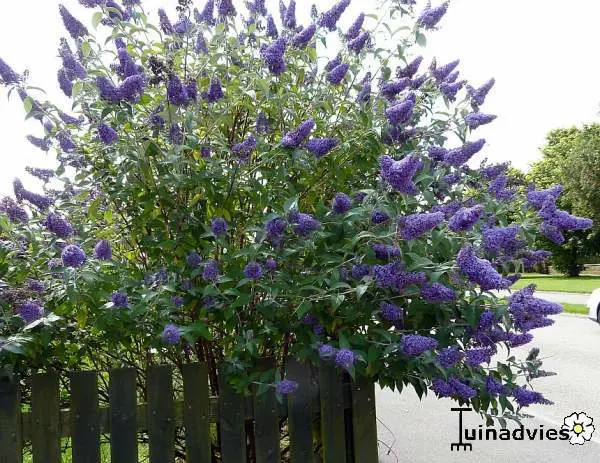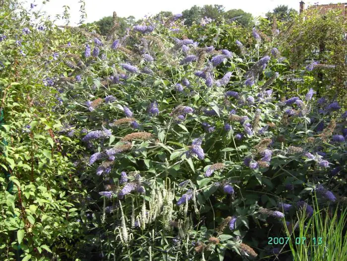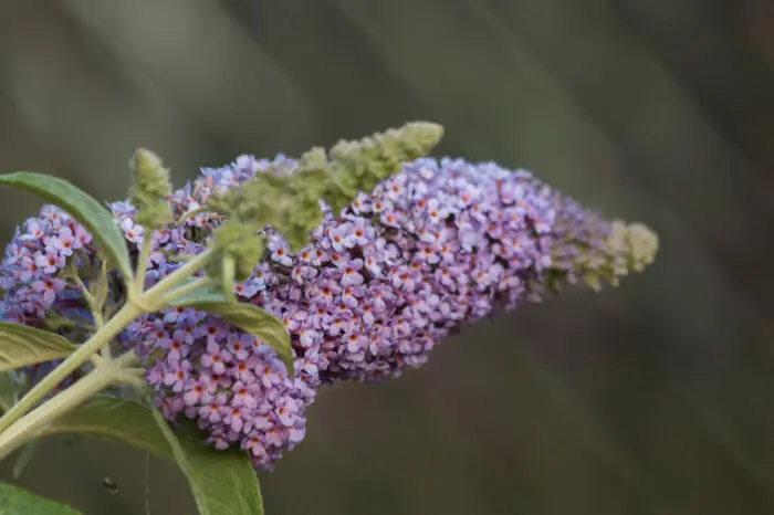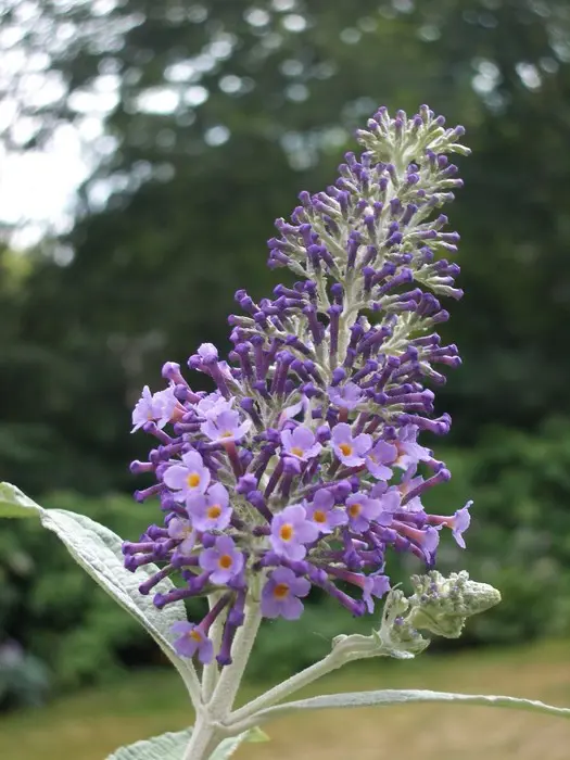 Buddleja 'Lochinch' bloeit met licht violetblauwe bloempluimen.