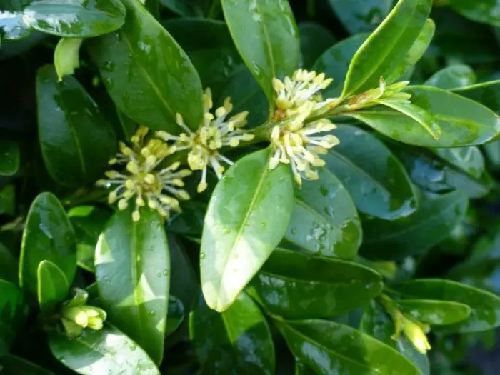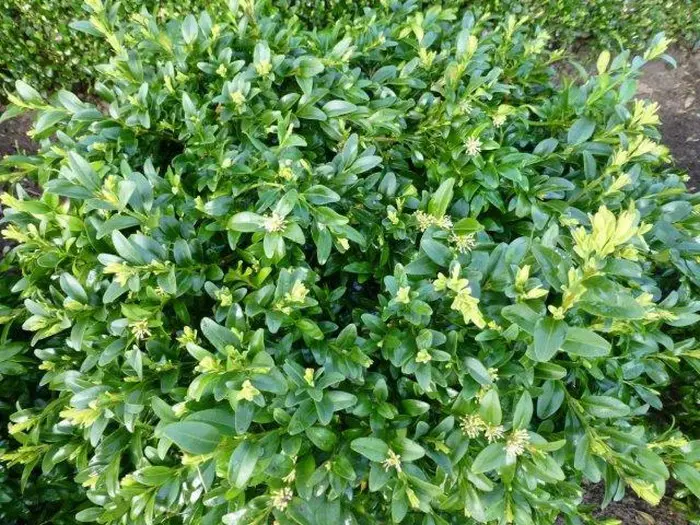 Buxus sempervirens 'Prostrata' is een breedgroeiende variëteit met kleine fijne blaadjes.