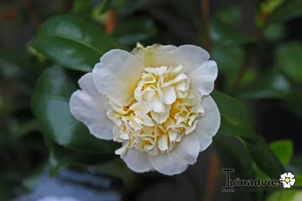 Camellia japonica 'Brushfield's Yellow' is een groenblijvende struik met eivormige, glanzende groene, leerachtige bladeren.