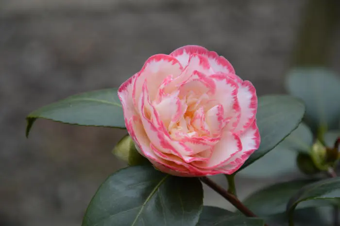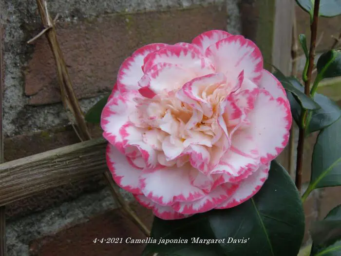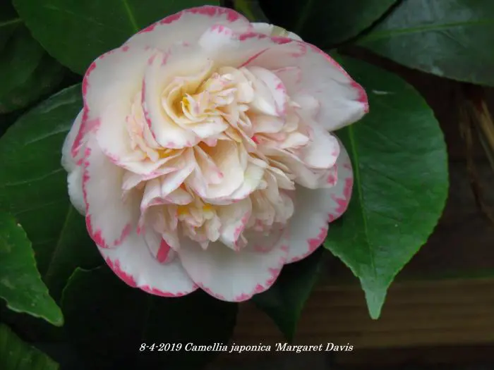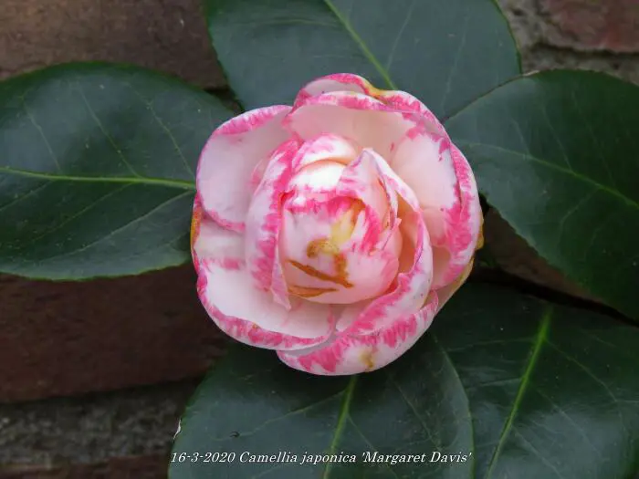 Camellia japonica 'Margaret Davis' is een groenblijvende struik met glanzend leerachtig blad.