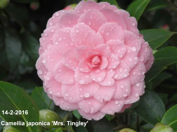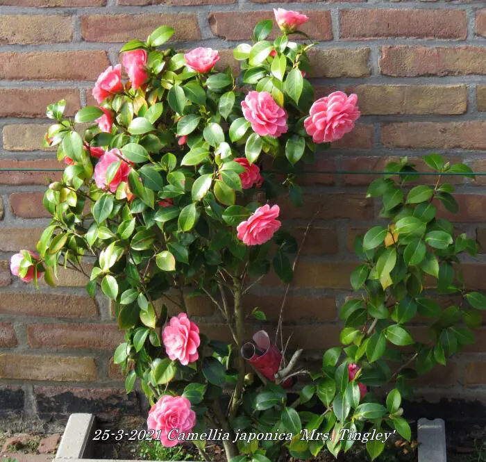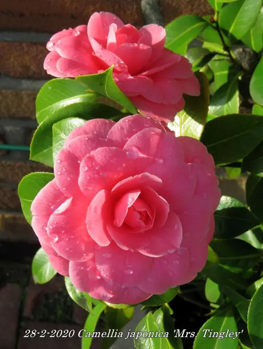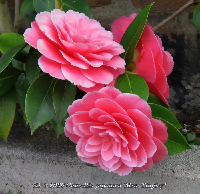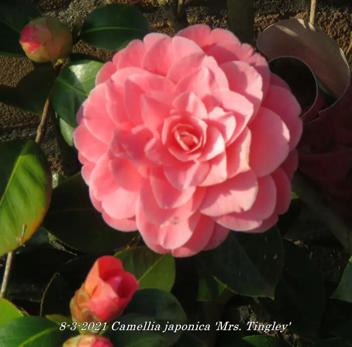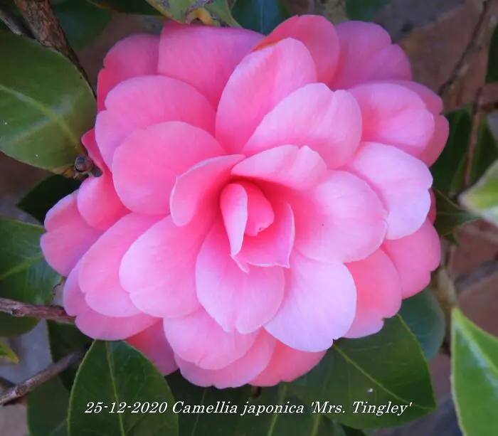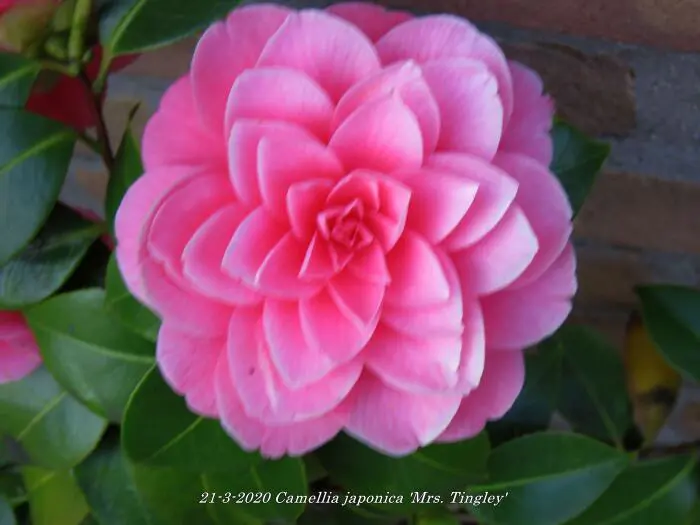 Camellia japonica 'Mrs. Tingley' bloeit met grote dubbele, karmijnroze tot zalmroze bloemen.