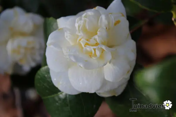 Camellia japonica 'Nobilissima' bloeit vroeger met gevulde, pioenvormige witte bloemen met in het midden zachtgele markering.