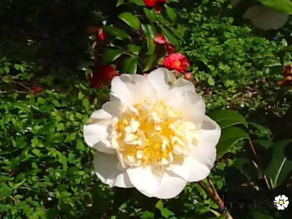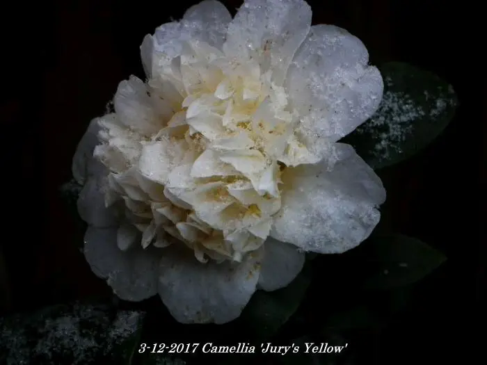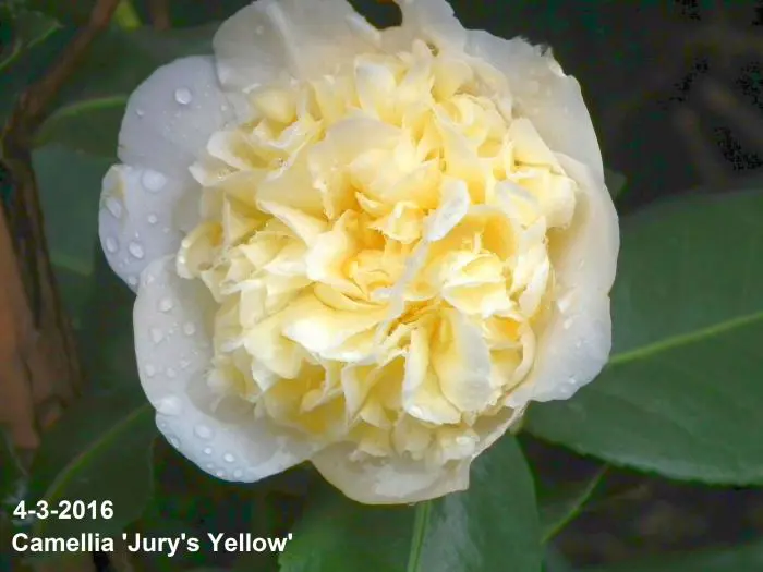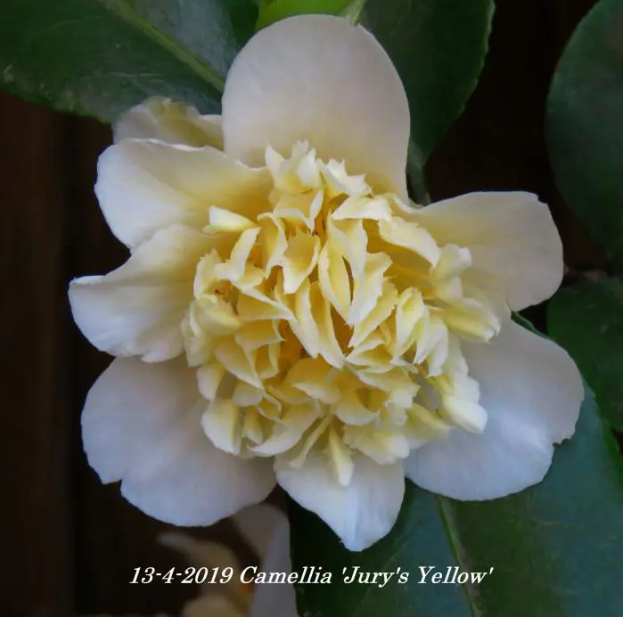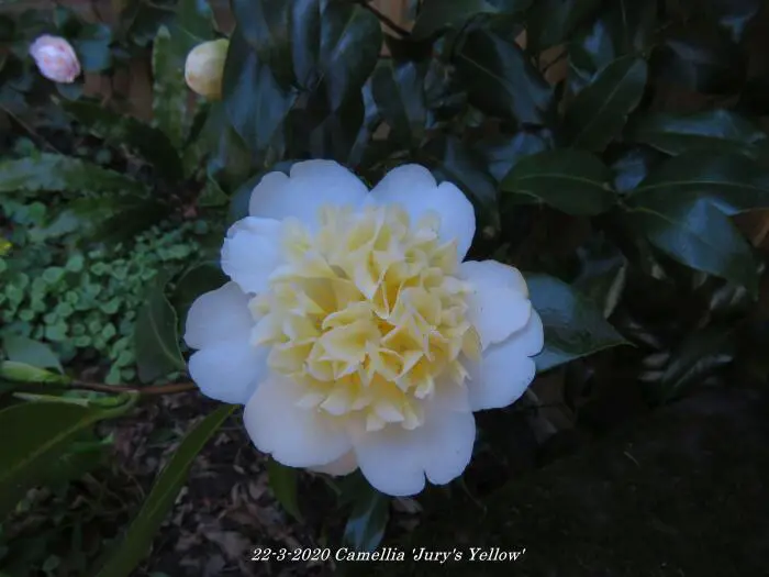 Camellia x williamsii 'Jury's Yellow' is een groenblijvende struik met eivormige, glanzende groene, leerachtige bladeren.